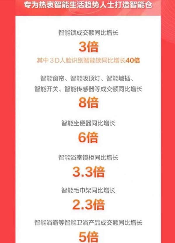 在專為熱衷智能生活趣事人士打造的智能倉中,智能鎖成交額同比增長3倍,其中3D人臉識別智能鎖成交額同比增長40倍。智能窗簾、智能吸頂燈、智能墻插、智能開關、智能傳感器成交額同比增長8倍。智能坐便器成交額同比增長6倍,智能浴霸等智能衛浴成交額同比增長5倍,智能浴室鏡柜成交額同比增長3.3倍,智能毛巾架成交額同比增長2.3倍。