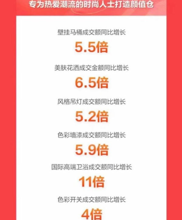 在專為熱愛潮流的時尚人士打造的顏值倉中,壁掛馬桶成交額同比增長5.5倍,美膚花灑成交額同比增長6.5倍,風格吊燈成交額同比增長5.2倍,色彩墻漆成交額同比增長5.9倍,國際高端衛浴成交額同比增長11倍,色彩開關成交額同比增長4倍。