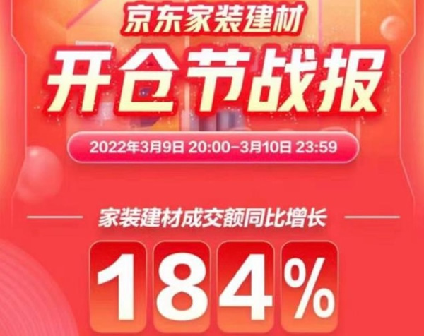 3月11日消息,日前,首屆京東家裝建材開倉節開啟。3月9日20:00-3月10日23:59,家裝建材成交額同比增長184%。