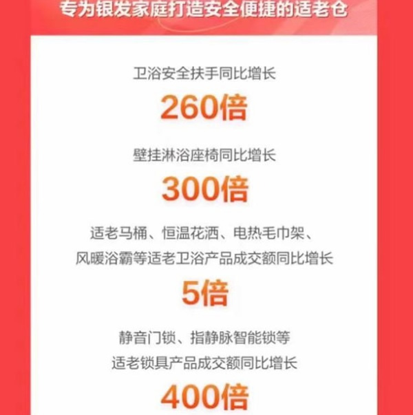 在專為銀發家庭打造的、安全便捷的適老倉中,衛浴安全扶手成交額同比增長260倍,壁掛淋浴座椅成交額同比增長300倍,靜音門鎖、指靜脈智能鎖等適老鎖具成交額同比增長400倍。此外,適老馬桶、恒溫花灑、電熱毛巾架、風暖浴霸等適老衛浴產品成交額同比增長5倍。