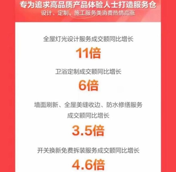 在專為追求高品質產品體驗人士打造的服務倉中,全屋燈光設計服務成交額同比增長11倍,衛浴定制成交額同比增長6倍,墻面刷新、全屋美縫收邊、防水修繕服務成交額同比增長3.5倍,開關換新免費拆裝服務成交額同比增長4.6倍。值得一提的是,截至3月10日23:59,京東家裝建材開倉節全渠道累計曝光量突破5000萬。