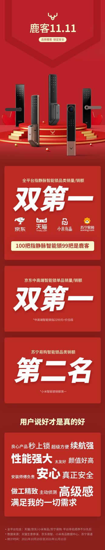 回看天貓與京東平臺(tái)相關(guān)數(shù)據(jù),今年雙十一鹿客全平臺(tái)指靜脈智能鎖品類銷量/銷額雙第一,2021年10月20日至2021年11月11日,鹿客智能鎖在天貓平臺(tái)實(shí)現(xiàn)天貓指靜脈智能鎖品類銷量/銷額雙第一;京東中高端智能鎖單品銷量/銷額雙第一等多項(xiàng)重量級(jí)大獎(jiǎng),穩(wěn)居全網(wǎng)銷冠。