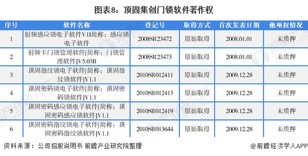 根據公司招股說明書披露,頂固集創射頻感應鎖、射頻卡門鎖、指紋鎖、密碼鎖、密碼感應鎖、密碼指紋鎖均具備相關計算機軟件著作權,具體情況如下: