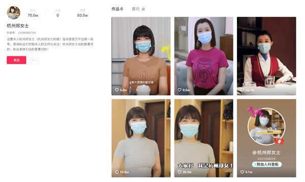 因為在《1818黃金眼》節目中維權智能門鎖而意外走紅的“杭州鄭女士”,開通抖音兩周時間,已經吸粉75萬,截稿前發布6段視頻,獲贊近百萬。