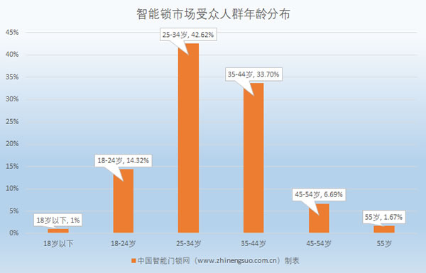 帶著問題找解決方案,這是商業行為中的一種常識,那么,智能鎖市場受眾人群到底是怎么分布的呢?初看,似乎很龐大,無從下手的感覺,但是,我們不妨換個思路,如果說線下的調查數據樣本較小,不具有統計價值,那么,我們從大數據的角度來看,還是有一定規律可循的。根據中國智能門鎖網產研院的數據,我們從行業提取了與智能鎖相關的關鍵詞,經過關鍵詞的跟蹤和比對分析,對這個特定的人群做了用戶年齡統計,下面是統計的圖表: