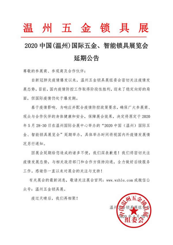 基于疫情影響,為響應并配合疫情防控政策要求,確保廣大參展商、觀眾與合作伙伴的身體健康和安全,保障展會效果,決定將原定于2020年5月28-30日在溫州國際會展中心舉辦的“2020中國(溫州)國際五金、智能鎖具展覽會”延期舉辦,具體舉辦時間將視國內外疫情發展情況另行通知。