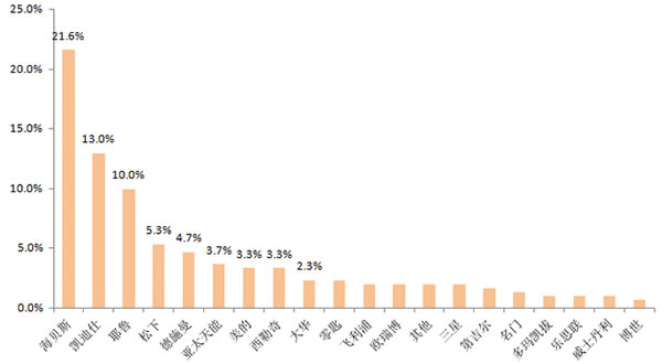 就品牌而言,海貝斯、凱迪仕、耶魯、松下和施德曼是2000多個(gè)住宅項(xiàng)目中應(yīng)用較多的智能門鎖品牌。前三個(gè)智能門鎖品牌項(xiàng)目應(yīng)用占比均超過10%,海貝斯應(yīng)用比例更是多達(dá)21.6%。