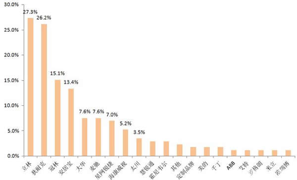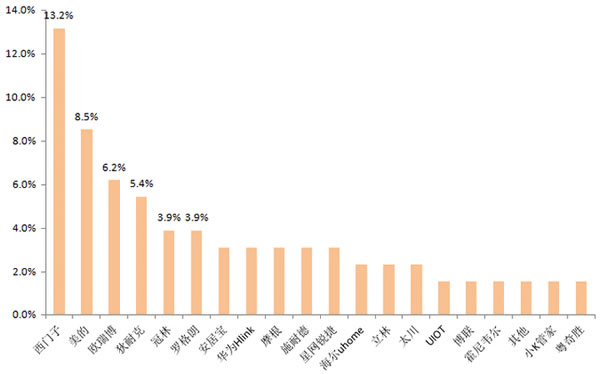 智能家居系統(tǒng)應(yīng)用品牌相對分散,使用率較高為西門子、美的、歐瑞博、狄耐克、羅格朗等一些品牌智能家居系統(tǒng)。其中,西門子智能家居系統(tǒng)應(yīng)用比例超過13%。