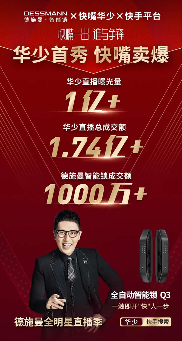 6月6日晚7點(diǎn),智能鎖領(lǐng)軍品牌德施曼攜手主持一哥快嘴華少、明星夫婦袁弘張歆藝,快手、抖音雙平臺(tái)直播首秀正式打響,德施曼爆品全自動(dòng)智能鎖Q3輪番轟炸兩大明星直播間,創(chuàng)下總曝光量破
