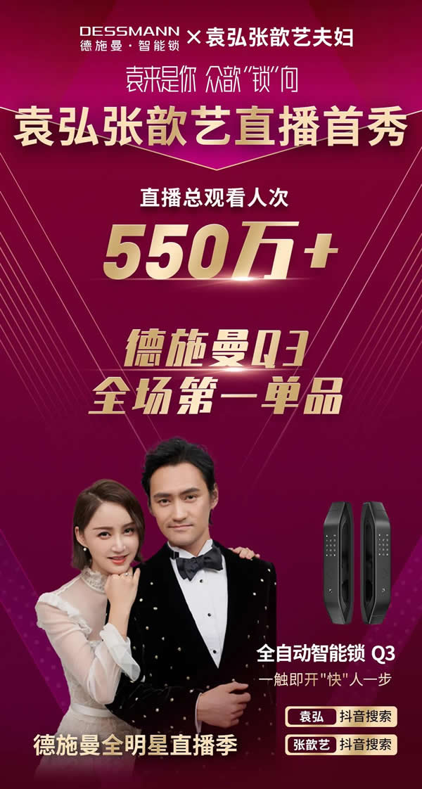 而明星夫婦袁弘張歆藝,在抖音直播間的高甜合體首秀,成績也十分不俗。作為甜蜜小家庭的代表推薦起美好生活必備的家居安防好物——德施曼全自動(dòng)智能鎖Q3,自是讓粉絲們紛紛感同身受,大呼過癮。