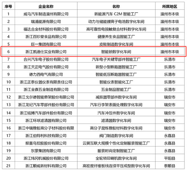 根據《浙江省數字化車間/智能工廠建設實施方案(2019-2022年)》(浙經信技術〔2019〕106號)和《關于開展2020年浙江省數字化車間/智能工廠和“未來工廠”申報工作的通知》(浙經信技術便函〔2020〕60號)要求,經企業申報、各地推薦和專家評審,現擬認定浙江凱迪仕實業有限公司“智能鎖數字化車間”等149個項目為2020年浙江省數字化車間/智能工廠,現予以公示。對擬認定結果如有意見和異議,可向我廳反映。