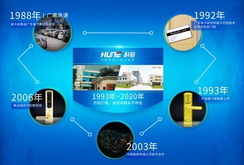 1988年,磁卡收費有廣東電子研究所研發;1992年廣東電子研究所磁卡識別技術應用在民用門鎖。終于,在1993年,科裕企業克服重重難關,自行研發的整套磁卡智能鎖上市,并參與國家相關部門的《磁卡識別標準》的起草,科裕智能鎖成為了中國第一個推出市場智能鎖的品牌。2003年,科裕智能鎖與韓國英特諾公司技術合作,2006年推出指紋識別智能鎖。