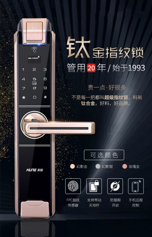 2017年,科裕智能鎖創造性推出鈦合金工藝。不但解決了智能鎖表面采用電鍍或噴漆工藝導致不很耐磨的問題,也解決了外觀表面光澤的問題,使智能鎖產品更科技時尚高大上。