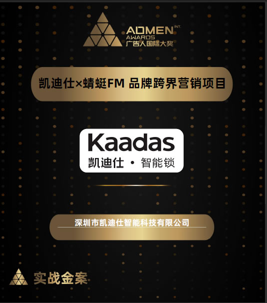 2020年8月25日,Y2Y品牌年輕節(jié)暨第九屆ADMEN國(guó)際大獎(jiǎng)?lì)C獎(jiǎng)盛典隆重舉行,Kaadas凱迪仕連續(xù)三年勇奪ADMEN國(guó)際大獎(jiǎng),再獲實(shí)戰(zhàn)金案獎(jiǎng)。2020年8月6日,在第六屆金梧獎(jiǎng)-移動(dòng)廣告創(chuàng)意節(jié)盛典現(xiàn)場(chǎng),Kaadas凱迪仕與華為、東風(fēng)日產(chǎn)、知乎、優(yōu)酷