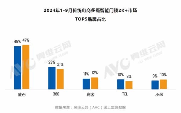 在高質(zhì)量的要求下,歷經(jīng)多年的產(chǎn)品打磨和技術(shù)創(chuàng)新,螢石智能門(mén)鎖在產(chǎn)品品質(zhì)、體驗(yàn)方面得到了用戶和客戶的廣泛認(rèn)可,尤其在多攝智能門(mén)鎖領(lǐng)域表現(xiàn)出色,占據(jù)高端市場(chǎng)的領(lǐng)先地位。奧維云網(wǎng)(AVC)線上監(jiān)測(cè)數(shù)據(jù)顯示,2024年1-9月傳統(tǒng)電商多攝智能門(mén)鎖2000元及以上的高端市場(chǎng)中,螢石品牌穩(wěn)居第一,其零售量占比超過(guò)45%,零售額占比達(dá)到47%,與360、鹿客、TCL、小米品牌共同包攬前五位置。